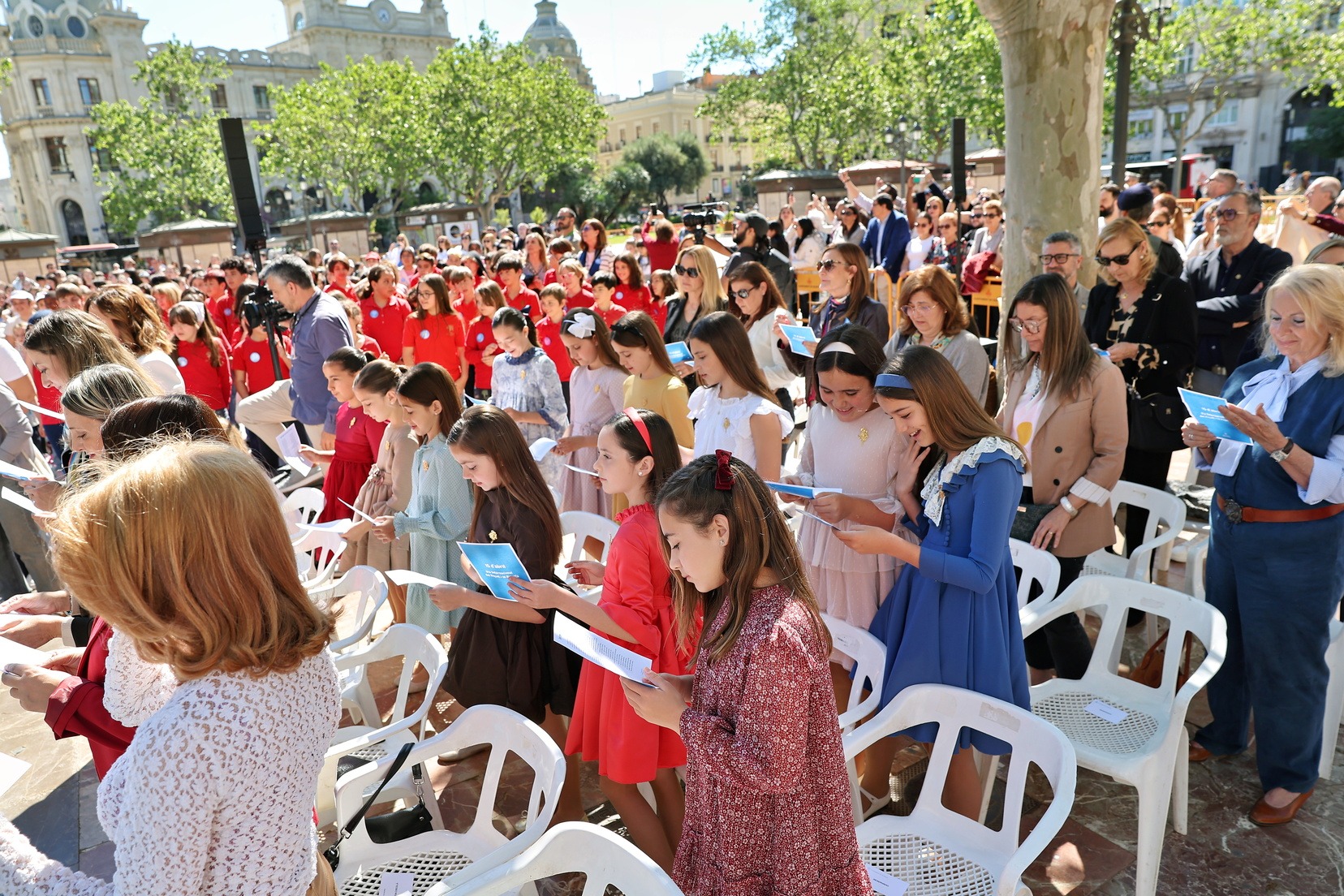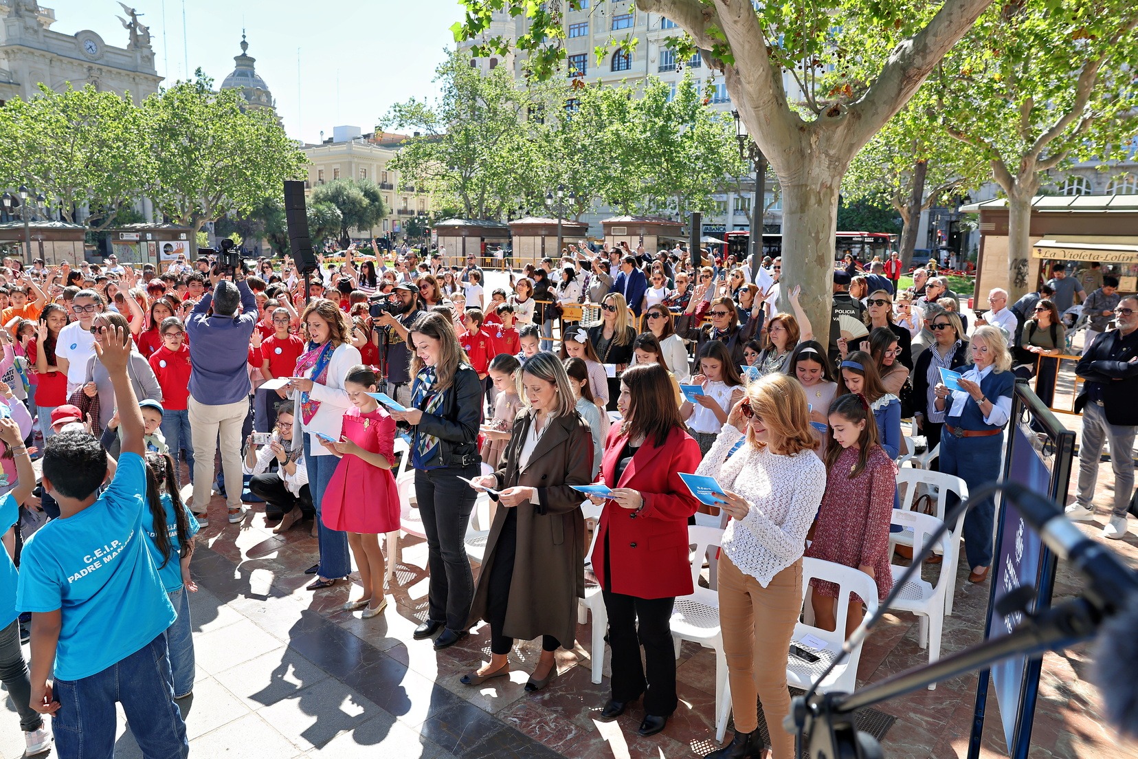 La plaça de l’Ajuntament de València s’ha omplit este matí de centenars de xiquets i xiquetes de diferents col·legis de la ciutat per a celebrar l’esdeveniment “Família, escola, ciutat” pel Dia Internacional del Xiquet i la Xiqueta.